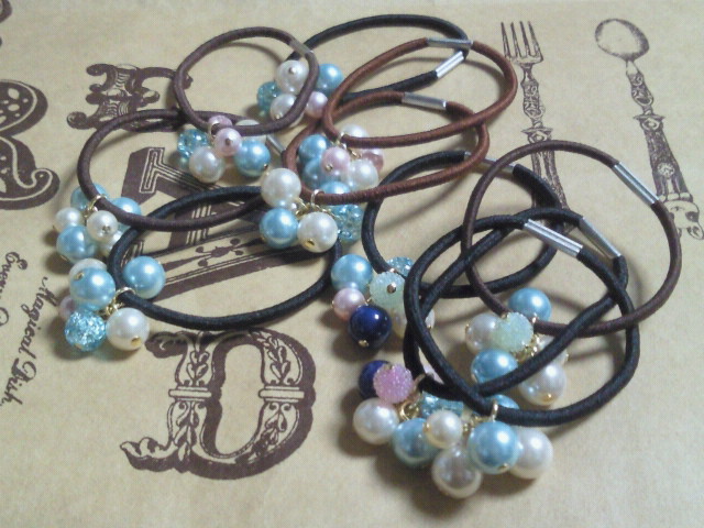 髪ゴムに丸カンをつけて、Tピンを通した樹脂パールやビーズを繋げた物を大量生産しました。