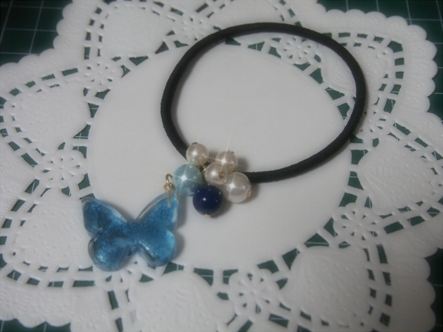パール等のパーツをいくつかとレジンを組み合わせて髪ゴムにつけました。