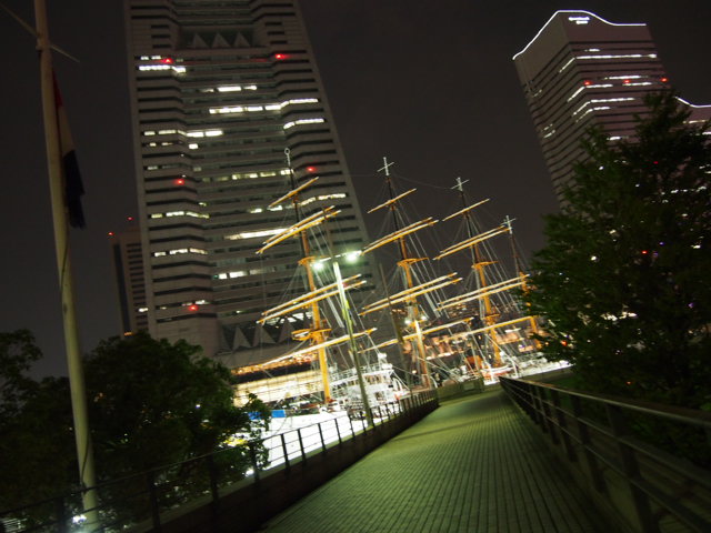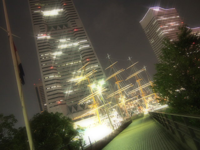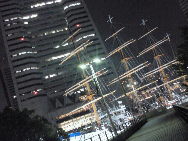 携帯で撮った夜景。みなとみらいの日本丸とランドマークの一部。