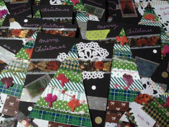 いっぱい作ったのですが、ツリーの柄やまわりのコラージュがどれもちょっとずつ違っているんですよ。