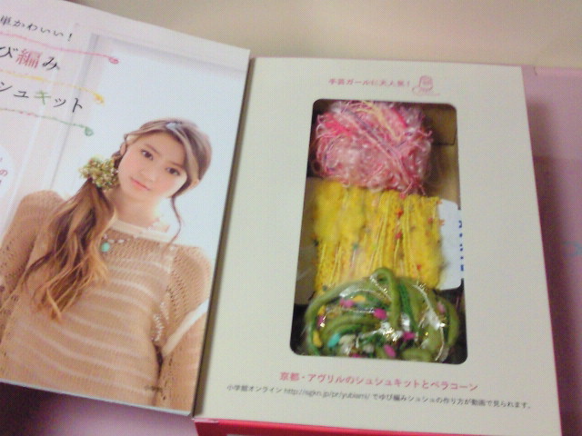中身はアヴリルの糸が3種類とシュシュやその他糸を使ったアクセサリーや雑貨等の作り方の本がくっついています。