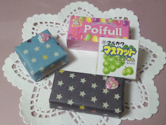 小さい駄菓子のガムやお菓子を折り紙でプレゼントっぽく包装してみましたv